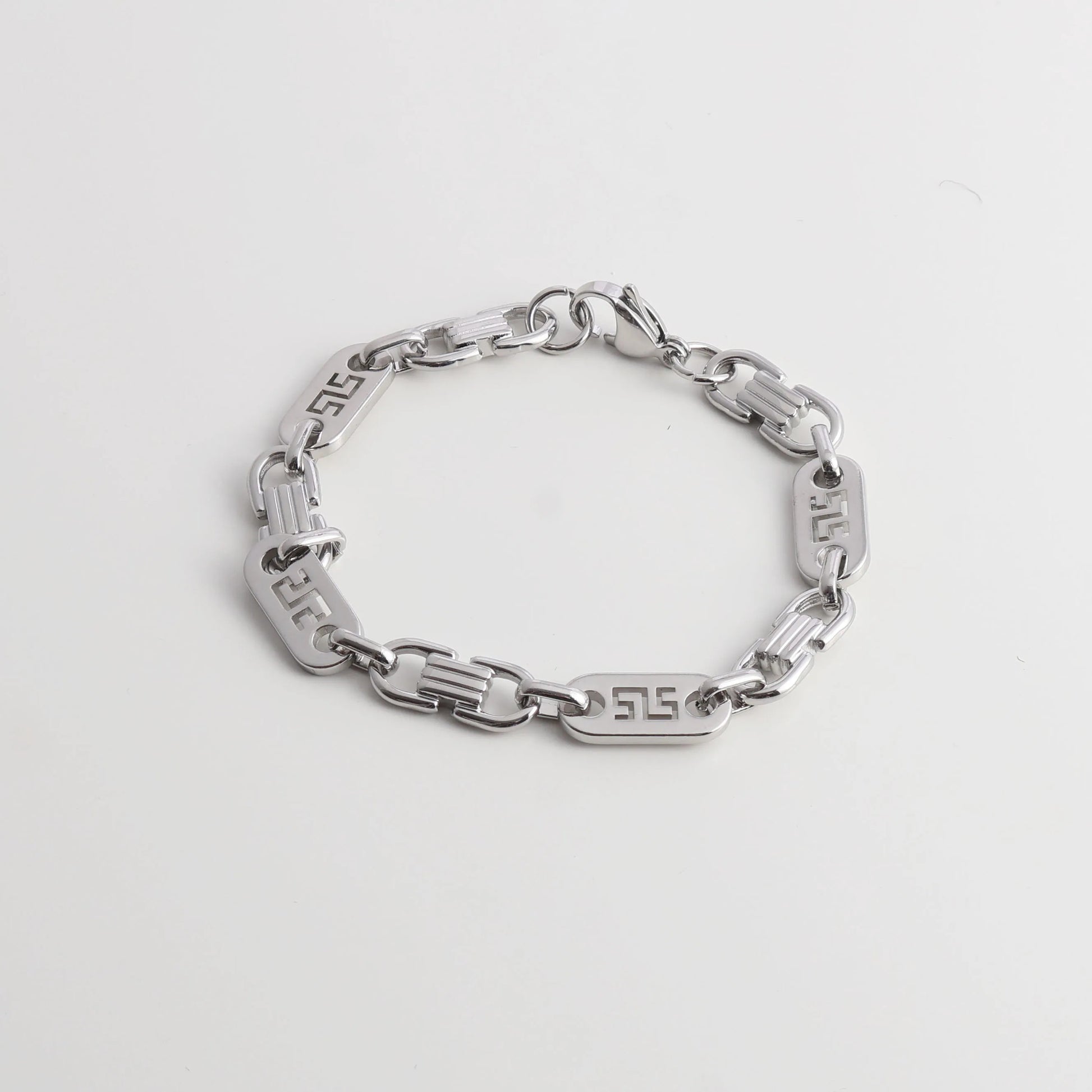 The Lucian Helix Bracelet blends bold geometry with refined minimalism. Featuring interlocking rectangular links engraved with a subtle Grecian-inspired motif, this piece is a modern take on timeless design. Its structured form creates a masculine edge while remaining sleek enough for everyday wear.