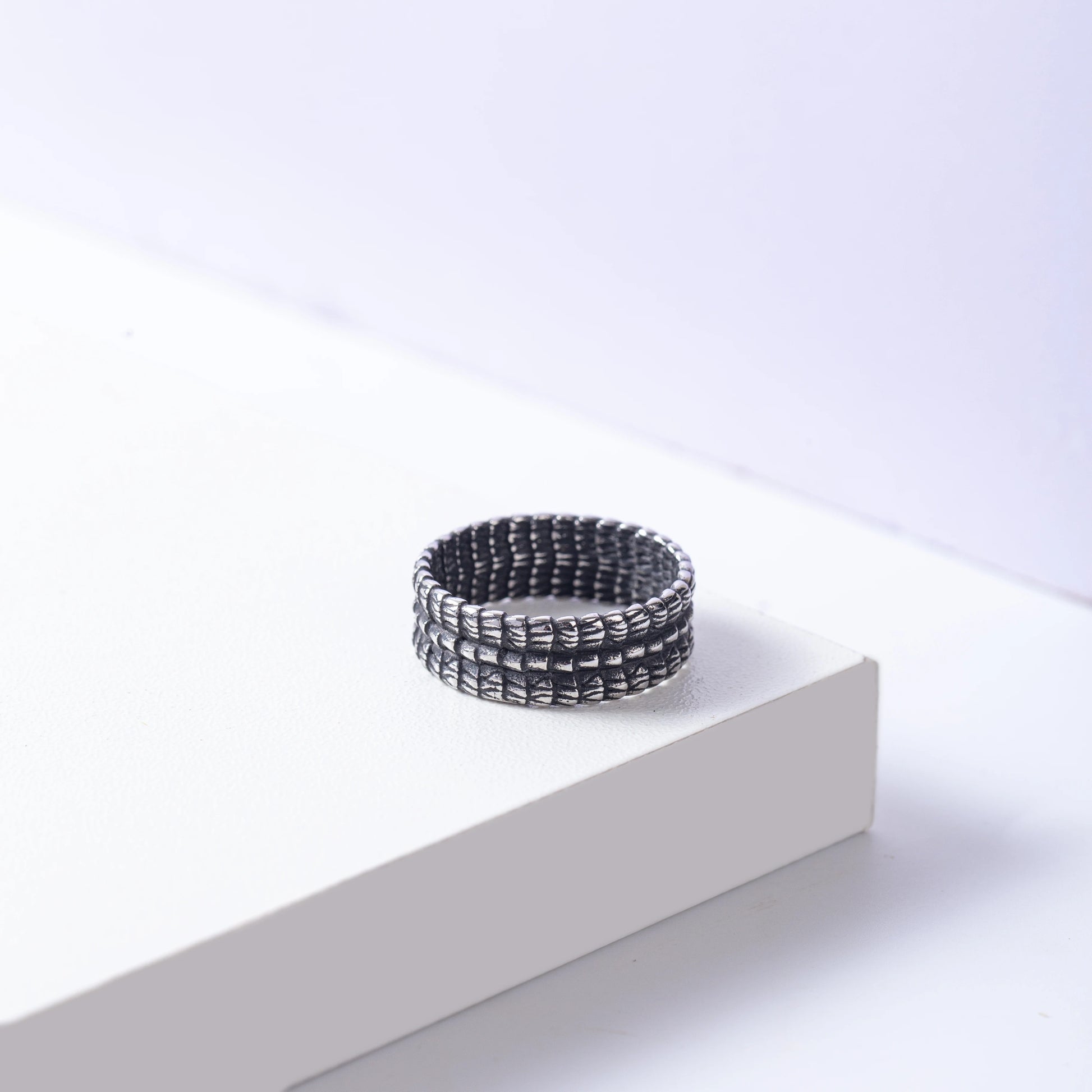 The Lucian Ironclad Band embodies rugged strength and timeless craftsmanship. Featuring a bold woven pattern carved into durable 316L stainless steel, this ring strikes the perfect balance between raw masculinity and refined detail. Its oxidized finish adds depth and character, making it a standout piece for men who want their accessories to carry presence and grit.