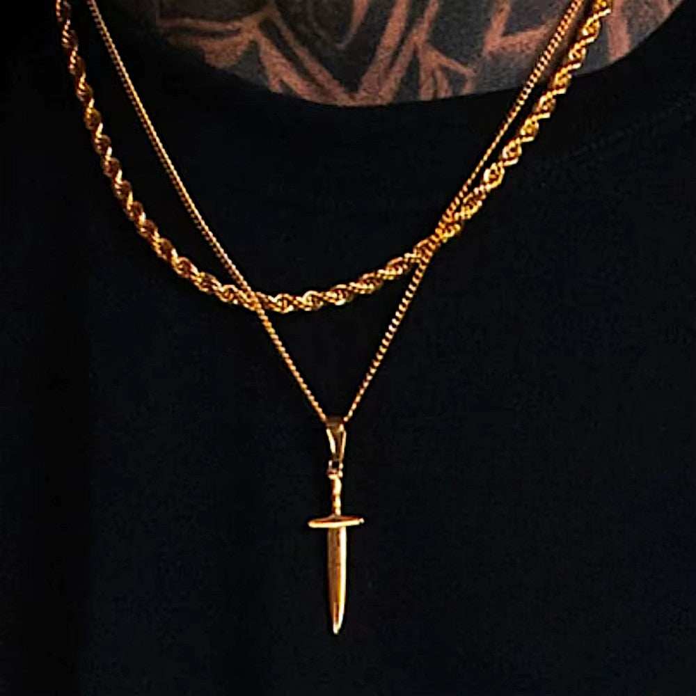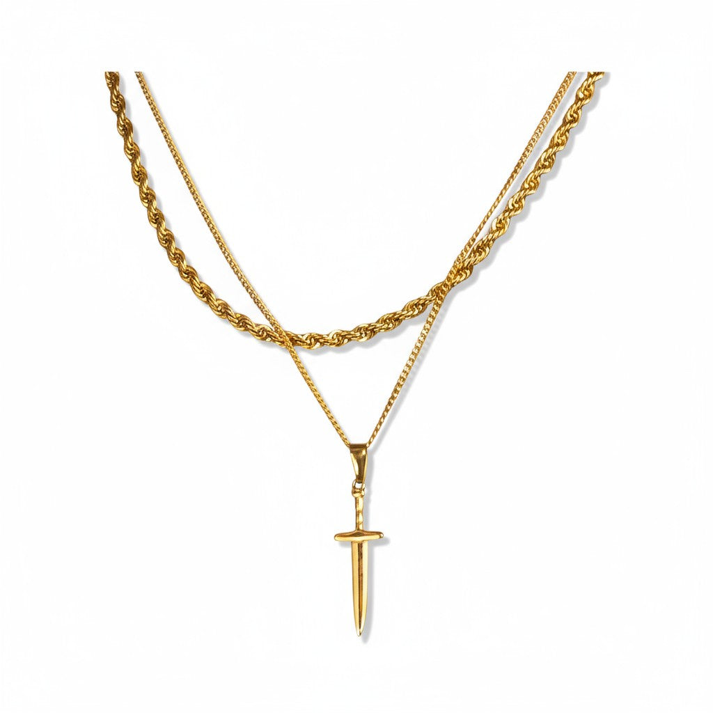 A symbol of courage and power. The Lucian Valor Set pairs a 3mm rope chain (50cm) with a 2.2mm curb chain (53cm), finished with a sharp dagger pendant designed to make a statement. Bold, refined, and built to stand out, this piece is for men who carry strength in their style.